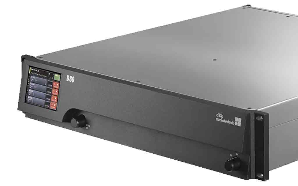 d&b audiotechnik D80 es un amplificador de cuatro canales y 2 RU diseñado para ofrecer alta densidad de potencia en entornos móviles y de instalación permanente. Compatible con todos los altavoces d&b, incluye un modo lineal y soporte completo de delay, ecualización y filtrado avanzado.
