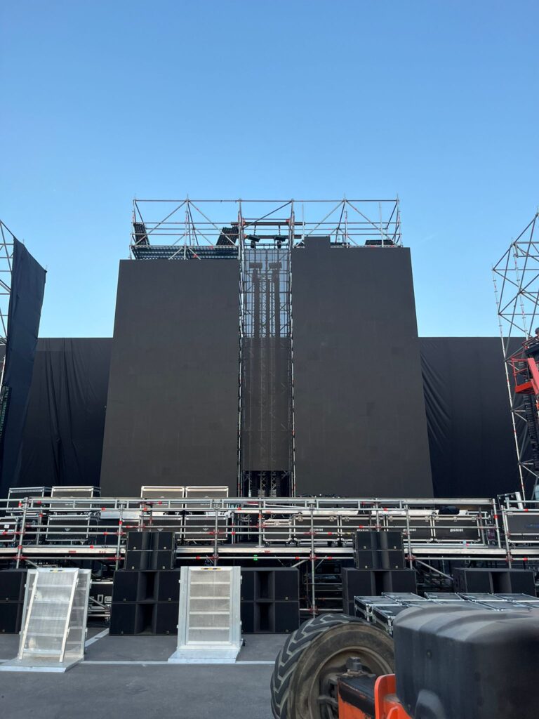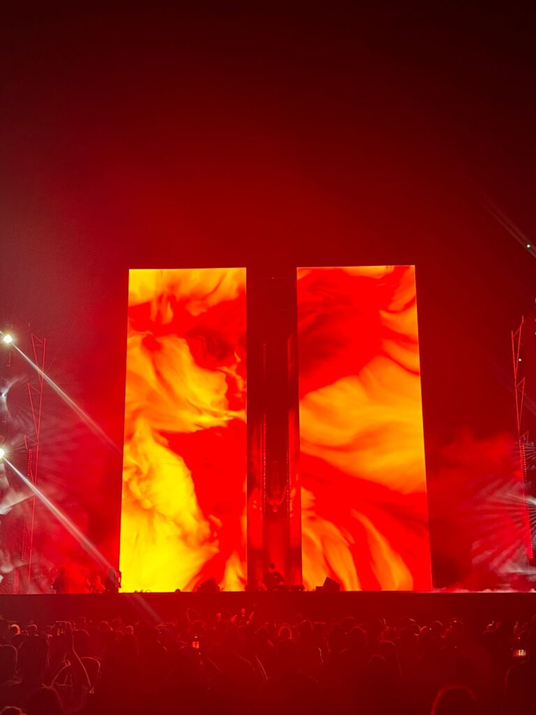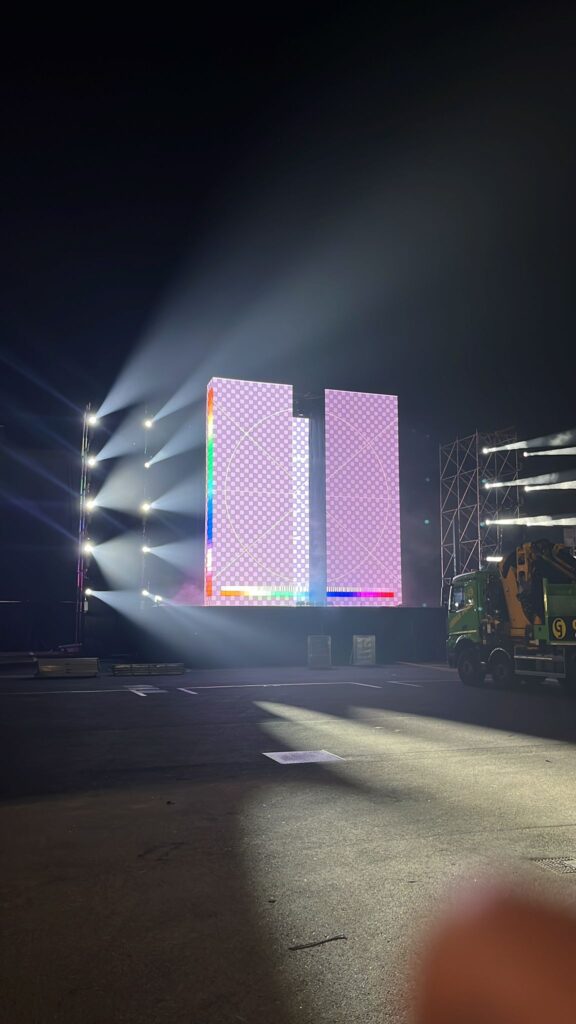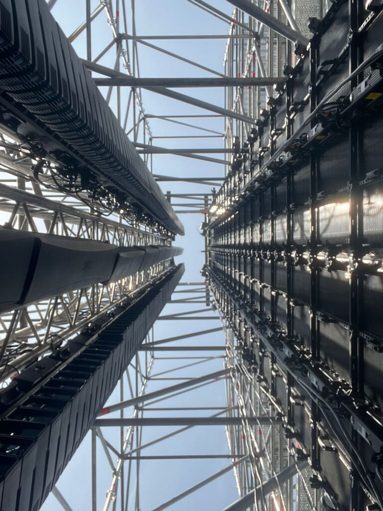 Para este montaje, se utilizó una pantalla LED semi transparente de 12 metros de alto que no solo servía como soporte visual principal, sino que además permitía crear un diálogo visual con la iluminación. Gracias a su diseño, los efectos de luz traspasaban la pantalla y se integraban con el contenido proyectado, generando una atmósfera envolvente, dinámica y llena de profundidad.