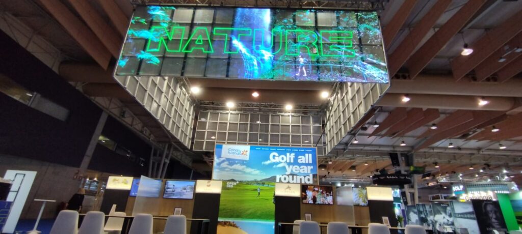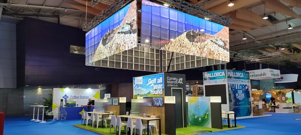 En esta ocasión, nos encargamos de la instalación de una pantalla LED de gran formato, un cubo de 4 caras, que se convirtió en el centro visual del stand de Islas Canarias. Gracias a su resolución y brillo, permitió mostrar vídeos promocionales, contenidos inspiradores durante toda la feria.