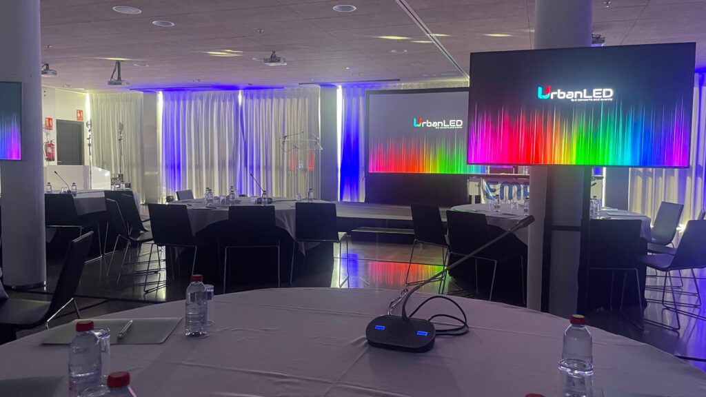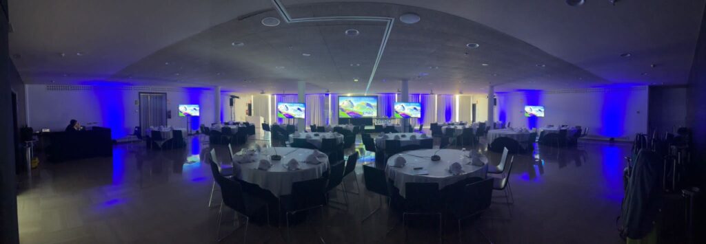 Además, adaptamos la iluminación al espacio y al ritmo de las presentaciones, combinando luz directa, ambiental y efectos sutiles que reforzaban la experiencia sin distraer de los contenidos. Las pantallas y proyecciones se configuraron estratégicamente para que cada asistente tuviera la mejor visibilidad, independientemente de su ubicación en la sala. De esta manera, conseguimos un equilibrio perfecto entre funcionalidad, estética y tecnología.