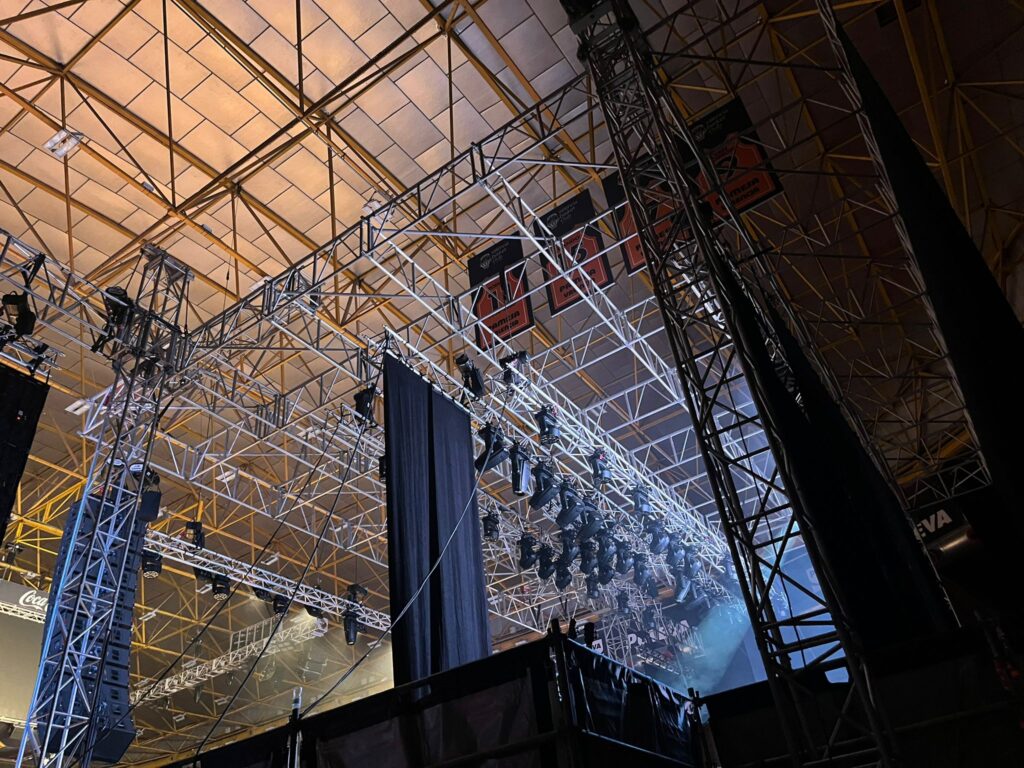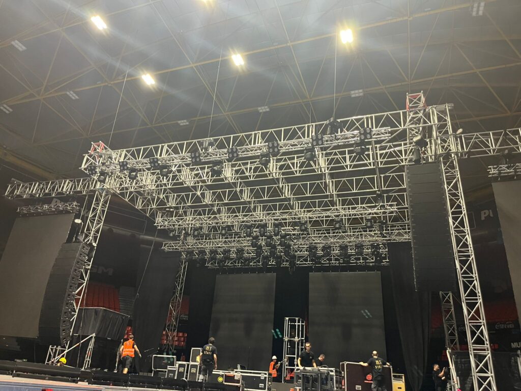 Nos encargamos de la instalación de estructuras Ground Support Litec Libera. Estas estructuras soportan la escenografía, la iluminación y todo el equipo audiovisual solicitado por la producción. Son resistentes, seguras y versátiles, adaptándose a la disposición del escenario y a las necesidades del espectáculo.