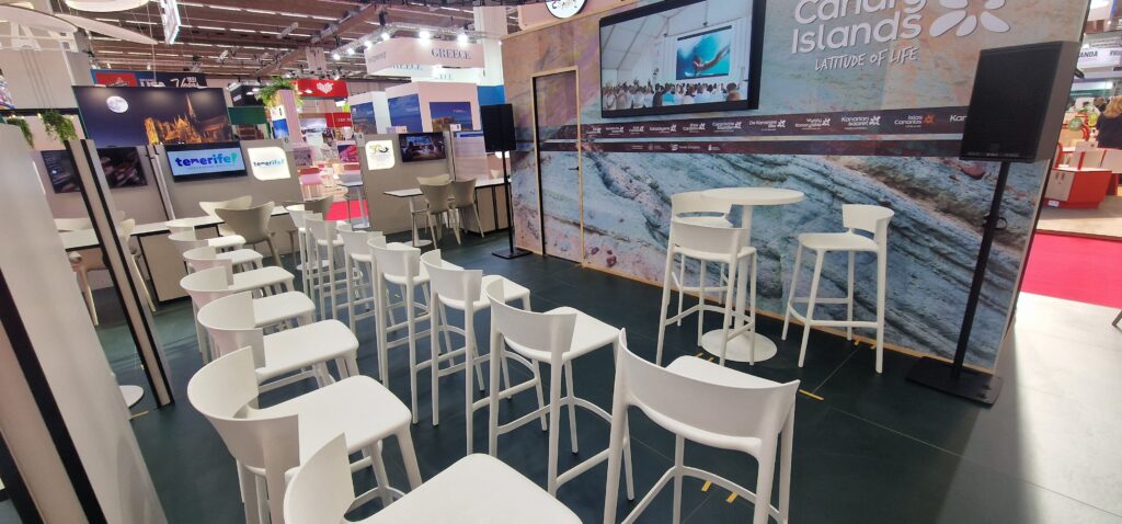 Uno de los principales elementos del espacio ha sido una impresionante pantalla LED circular de 22 metros, acompañada por varias pantallas digitales distribuidas estratégicamente por todo el stand. Ésta propuesta visual envolvente permitió sumergir a los visitantes en los paisajes, colores y sensaciones únicas de las Islas Canarias.