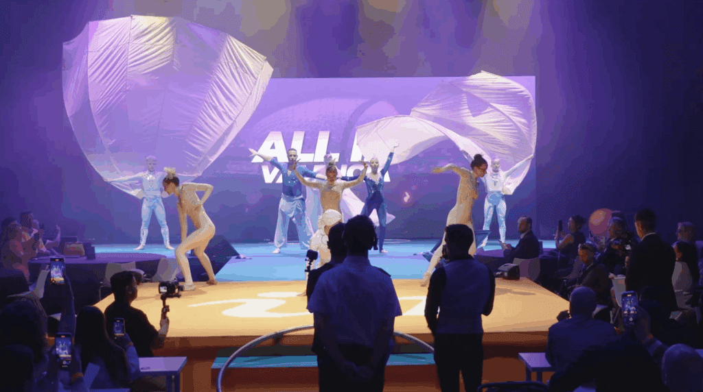 El elemento central del escenario fue una pantalla LED gigante, que funcionó como punto focal del montaje. En ella se proyectaron los principales contenidos visuales del evento, generando un impacto inmediato en el público. Esta pantalla se complementó con dos pantallas laterales, que aseguraban una experiencia visual óptima desde cualquier ángulo del auditorio, reforzando la visibilidad y la inmersión de todos los asistentes.